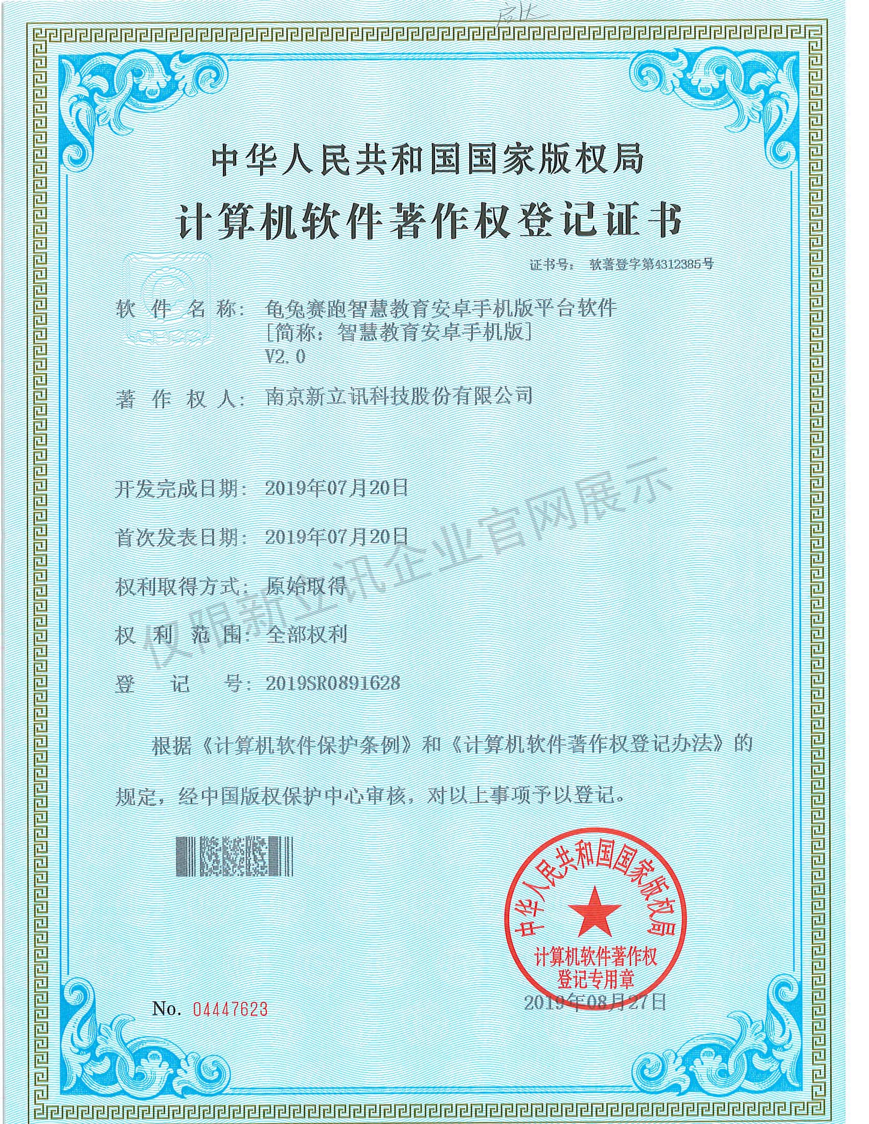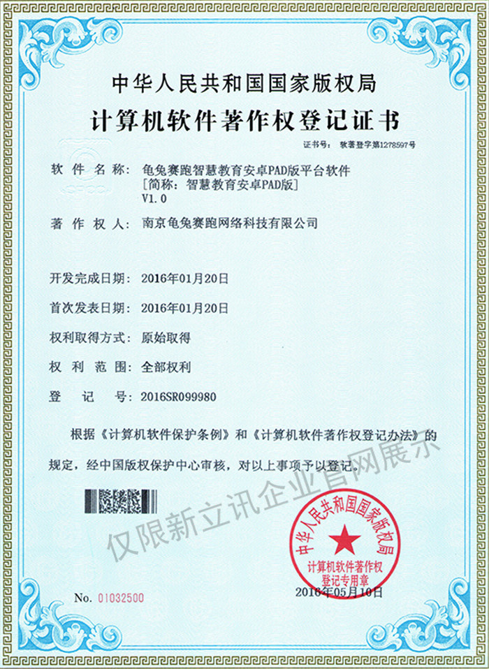 • 2016-07-20龜兔賽跑軟件著作權證書--龜兔賽跑智慧教育安卓手機版平臺軟件V1.0查看