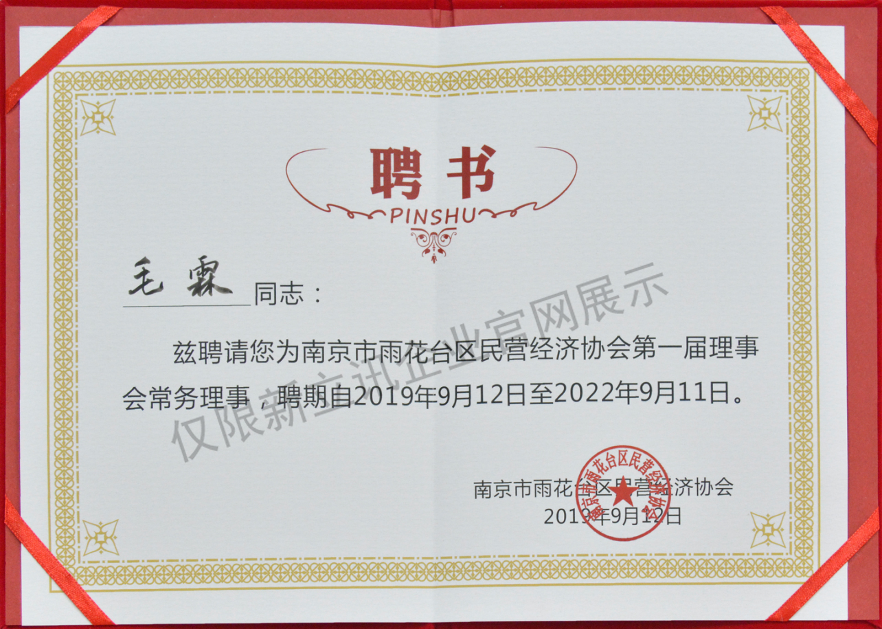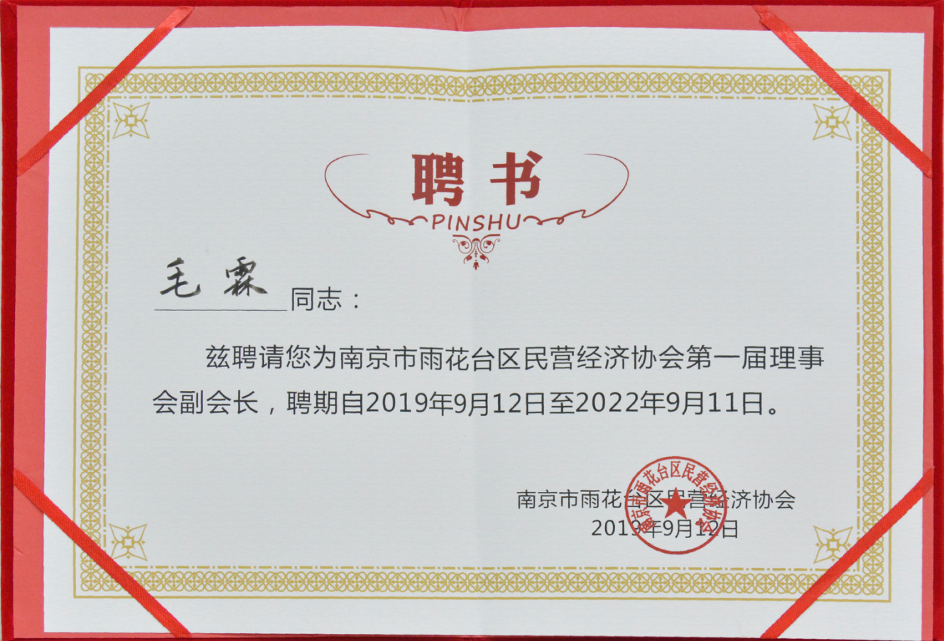• 2019-09-13南京市雨花臺區民營經濟協會理事會副會長查看