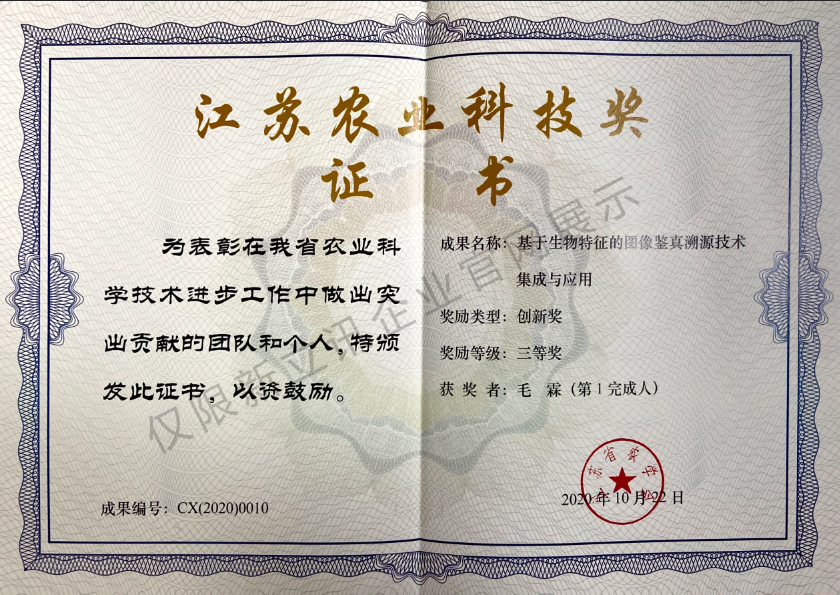 • 2020-11-24鑒真溯源技術集成與應用創新獎(江蘇農業科技獎)-毛霖查看