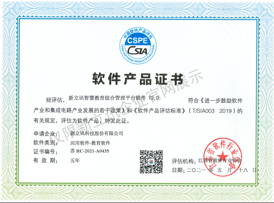 • 2021-06-08軟件產品證書--新立訊智慧教育綜合管理平臺軟件V2.0查看