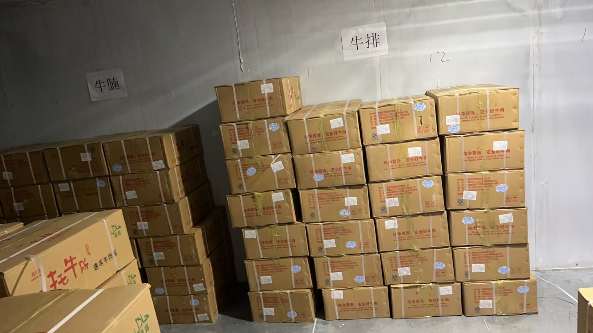 倉庫內(nèi)擺放的牛排、牛腩等青海產(chǎn)品。