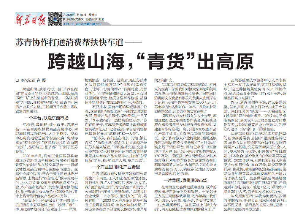 “前不久,我們還在南京、無錫、鎮江設立了‘西部優選’提貨點,讓青海特產離江蘇人越來越近。”李積鑫補充道,交易中心股東新立訊科技集團還與鹽城共同投資建成華東農產品交易中心,打造“東部優品”平臺,推動“西產入東、東產西送”。