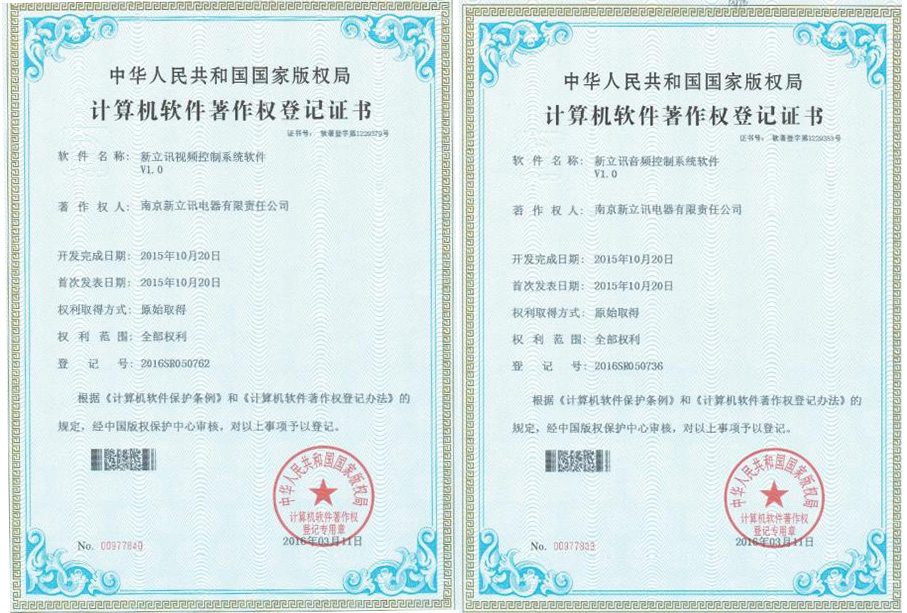 2016年3月11日, 新立訊企業(yè)作為自身擁有核心技術、創(chuàng)新能力的國家高新技術企業(yè),公司高新技術研發(fā)中心研發(fā)團隊所研發(fā)的“新立訊視頻系統(tǒng)控制軟件V1.0”以及“新立訊音頻系統(tǒng)控制軟件V1.0”獲得了由國家版權局頒發(fā)的“計算機軟件著作權登記證書”。至此新立訊企業(yè)擁有發(fā)明專利1項,實用新型專利39項,外觀專利7項,計算機軟件著作權5項,商標3項。
