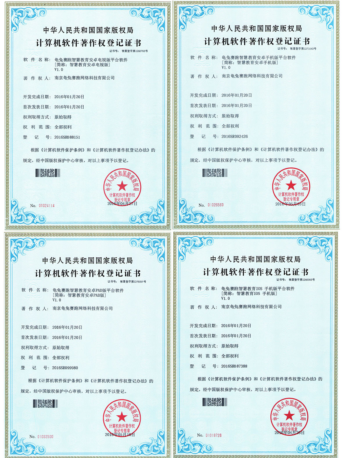 2016年4月27日, 新立訊企業(yè)作為自身擁有核心技術、創(chuàng)新能力的國家高新技術企業(yè),公司高新技術研發(fā)中心研發(fā)團隊所研發(fā)的“龜兔賽跑智慧教育IOS手機版平臺軟件V1.0”、龜兔賽跑智慧教育安卓手機版平臺軟件V1.0”、龜兔賽跑智慧教育安卓PAD版平臺軟件V1.0”以及“龜兔賽跑智慧教育安卓電視版平臺軟件V1.0”獲得了由國家版權局頒發(fā)的“計算機軟件著作權登記證書”。至此新立訊企業(yè)擁有發(fā)明專利1項,實用新型專利39項,外觀專利7項,計算機軟件著作權12項,商標3項。