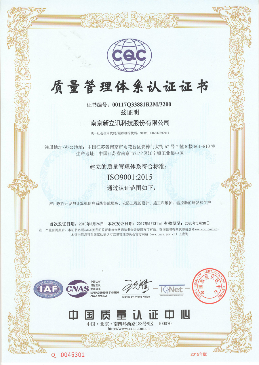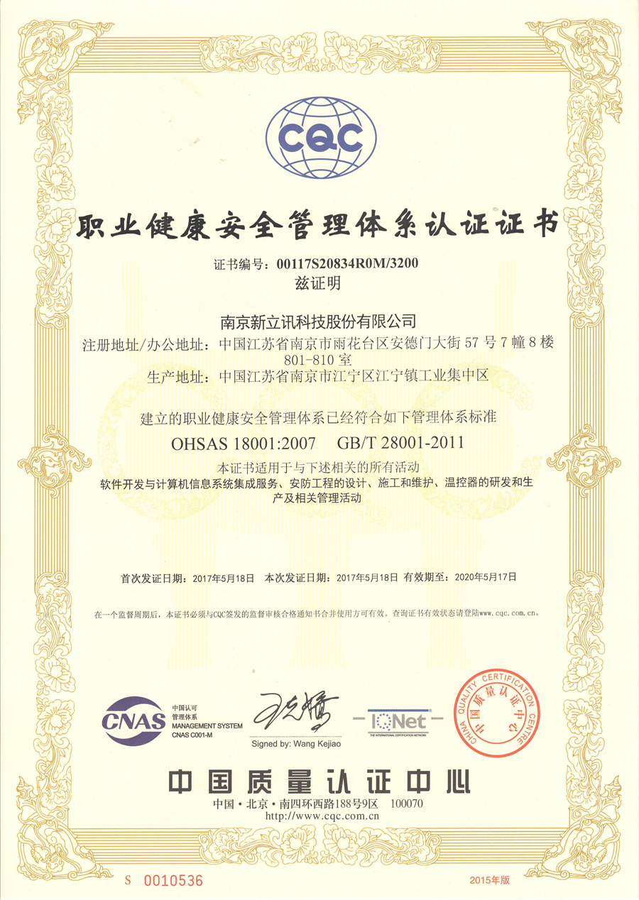 2017年5月,新立訊經(jīng)中國權(quán)威認(rèn)證機(jī)構(gòu)CQC(中國質(zhì)量認(rèn)證中心)全面、嚴(yán)格的評定與審核,正式通過ISO9001國際質(zhì)量管理體系認(rèn)證、ISO14001國際環(huán)境管理體系認(rèn)證、OHSAS18001職業(yè)健康安全管理體系認(rèn)證三大國際管理體系認(rèn)證,并獲得相關(guān)證書。證書涵蓋范圍包括軟件開發(fā)與計算機(jī)信息系統(tǒng)集成服務(wù),安防工程的設(shè)計、施工和維護(hù),溫控器的研發(fā)和生產(chǎn)及相關(guān)管理活動。這意味著新立訊成為CNAS(中國合格評定國家認(rèn)可委員會)、IQNet(國際認(rèn)證聯(lián)盟)和IAF(國際認(rèn)可論壇)三方共同認(rèn)可的綜合數(shù)據(jù)應(yīng)用服務(wù)商,更標(biāo)志著新立訊的質(zhì)量管理、環(huán)境管理、健康安全管理等已達(dá)到國際先進(jìn)水平。同時此三項證書的取得是對新立訊企業(yè)管理理念和質(zhì)量管理水平的充分肯定,也為企業(yè)向社會提供優(yōu)質(zhì)的產(chǎn)品和服務(wù)提供了強(qiáng)有力的保障。