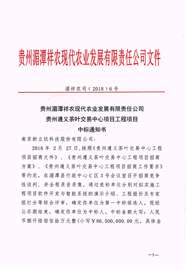 春節(jié)剛過(guò),即傳來(lái)喜訊:2018年2月27日,新立訊中標(biāo)貴州遵義茶葉交易中心“智慧茶交所”工程項(xiàng)目,項(xiàng)目造價(jià)8700余萬(wàn)元。