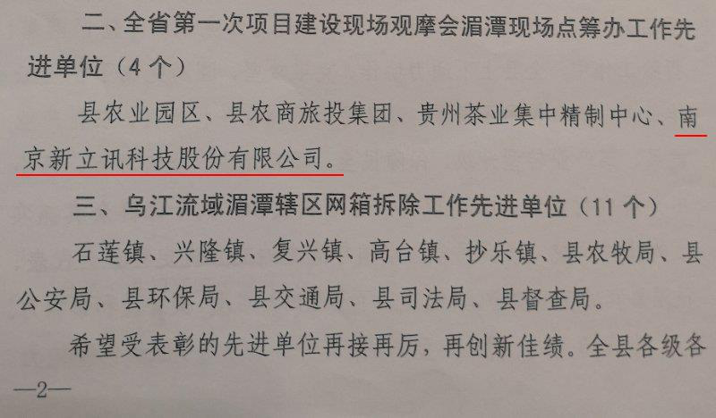 2018年5月16日,貴州省湄潭縣委、縣人民政府對南京新立訊科技股份有限公司在2018貴州茶“一節(jié)一會”籌備、貴州省全省第一次扶貧項目建設(shè)現(xiàn)場觀摩會湄潭現(xiàn)場點籌辦等工作中的優(yōu)秀表現(xiàn)及突出貢獻(xiàn)進(jìn)行通報表揚(yáng)。