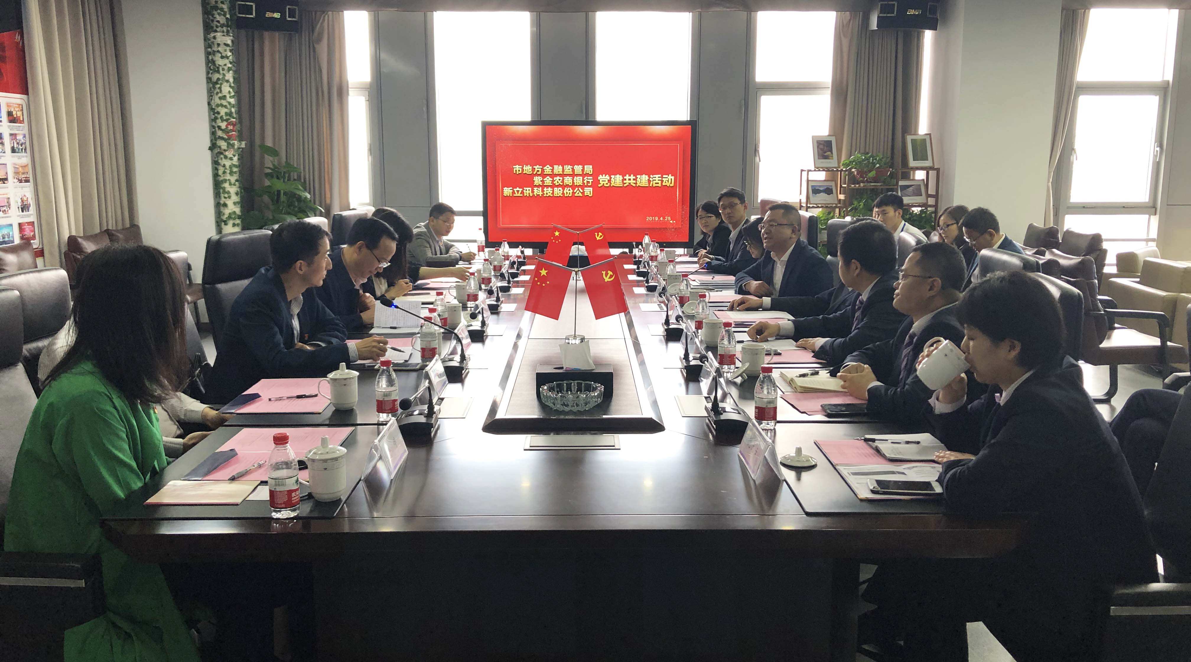 2019年4月25日,南京市地方金融監(jiān)管局、紫金農(nóng)商銀行與南京新立訊科技股份有限公司共同在新立訊總部開展黨建共建活動(dòng)。金融監(jiān)管局黨組書記、局長(zhǎng)劉永彪,紫金農(nóng)商銀行黨委副書記王留平;中國(guó)(南京)軟件谷高新局局長(zhǎng)吳瑩;新立訊董事長(zhǎng)毛霖、公司高管層及各方黨員代表等共同參與此次黨建活動(dòng)。共建活動(dòng)由新立訊黨支部書記、副總經(jīng)理李偉主持。