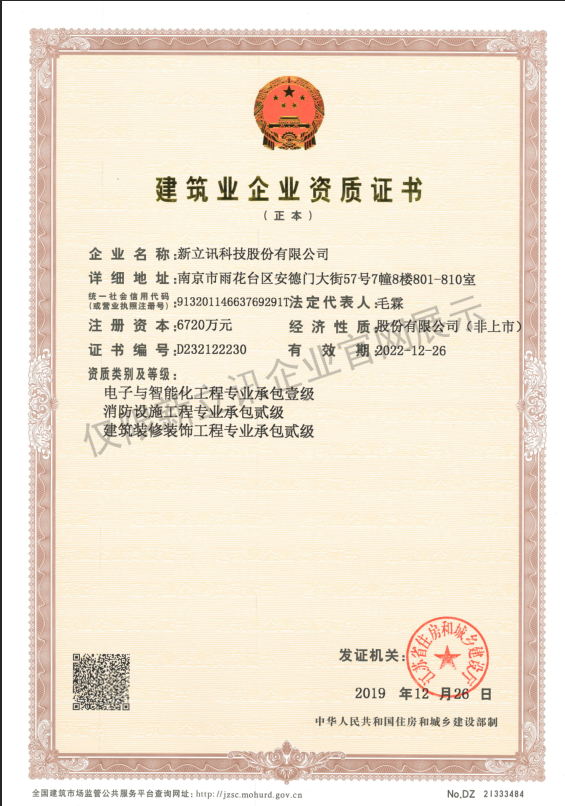 近日,經江蘇省住房和城鄉(xiāng)建設廳審核批準,新立訊科技股份有限公司成功取得“電子與智能化工程專業(yè)承包壹級資質”。該項資質為電子工程、建筑智能化行業(yè)最高等級資質,對企業(yè)綜合實力有嚴格的要求,獲得此資質可承擔不受限額的各類電子工程、建筑智能化項目。