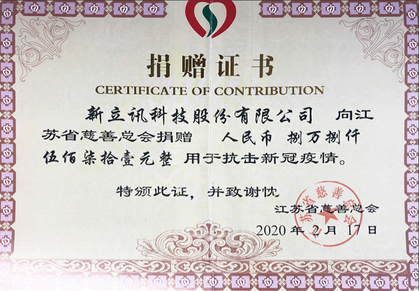 自新冠肺炎疫情發(fā)生以來,新立訊公司高度關(guān)注疫情進(jìn)展,一方面從實(shí)從細(xì)抓好企業(yè)內(nèi)部的疫情防控工作,另一方面積極復(fù)工復(fù)產(chǎn)支持和配合政府做好疫情防控。與此同時,新立訊不忘感恩社會,通過江蘇省慈善總會給疫情重災(zāi)區(qū)湖北捐款5萬元,并積極動員公司全體員工進(jìn)行募捐,籌得全體員工、分支機(jī)構(gòu)及家屬、愛心人士善款38571元,共計籌得善款88571元,所有善款通過江蘇省慈善總會轉(zhuǎn)給湖北疫情災(zāi)區(qū)。