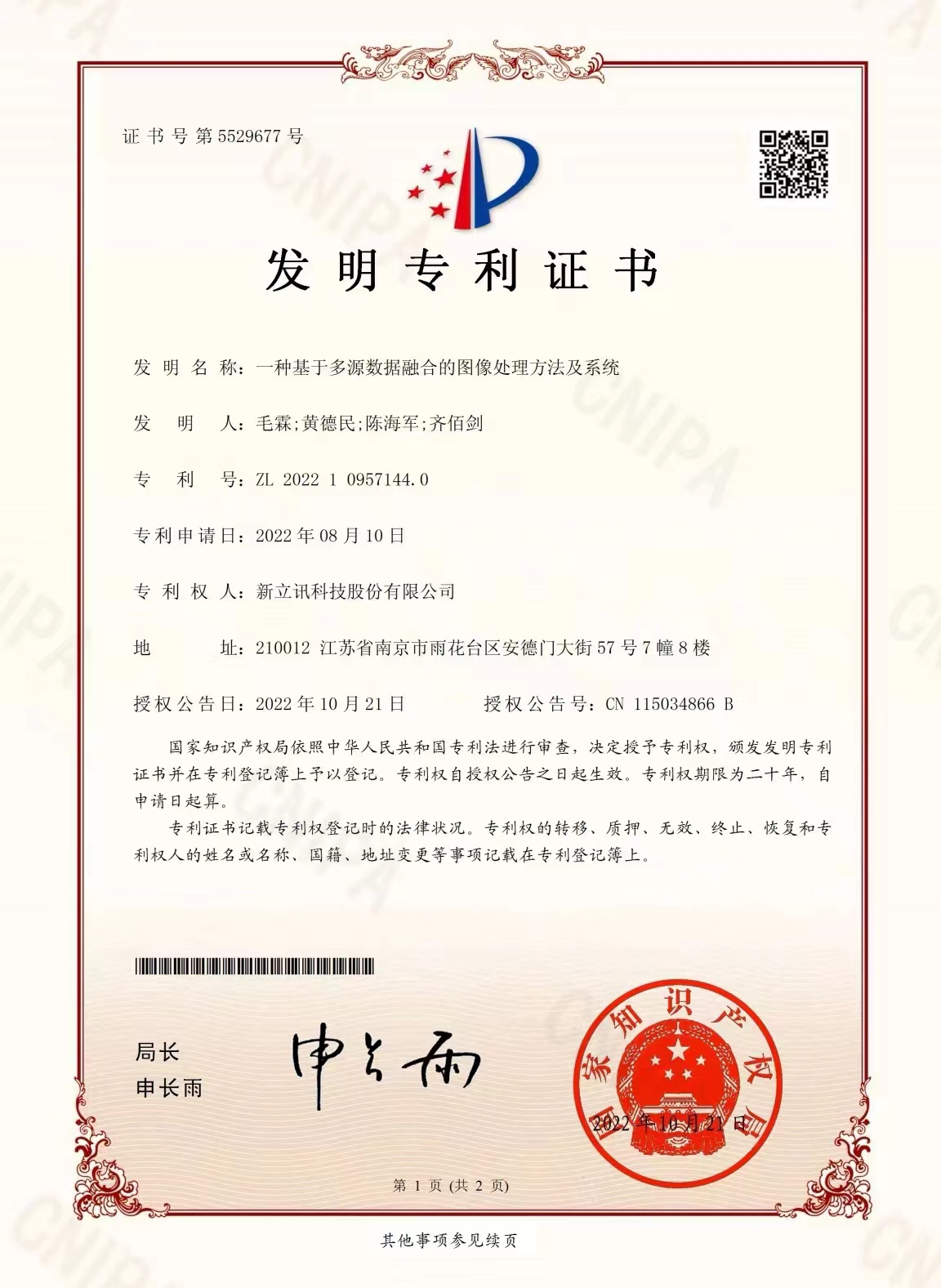 近日,我司新獲國(guó)家知識(shí)產(chǎn)權(quán)局兩項(xiàng)發(fā)明專利,發(fā)明專利號(hào):ZL2022109571440,一種基于多源數(shù)據(jù)融合的圖像處理方法及系統(tǒng);發(fā)明專利號(hào):ZL2022109571455,一種數(shù)據(jù)鑒真處理方法、裝裝置、計(jì)算機(jī)設(shè)備及存儲(chǔ)介質(zhì)。
