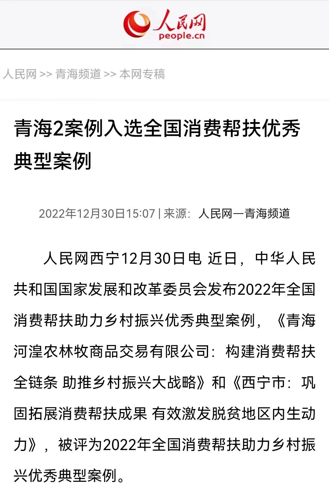 人民網(wǎng)西寧12月30日電 近日,中華人民共和國(guó)國(guó)家發(fā)展和改革委員會(huì)發(fā)布2022年全國(guó)消費(fèi)幫扶助力鄉(xiāng)村振興優(yōu)秀典型案例,《青海河湟農(nóng)林牧商品交易有限公司(青海農(nóng)林牧商品交易中心):構(gòu)建消費(fèi)幫扶全鏈條 助推鄉(xiāng)村振興大戰(zhàn)略》被評(píng)為2022年全國(guó)消費(fèi)幫扶助力鄉(xiāng)村振興優(yōu)秀典型案例。