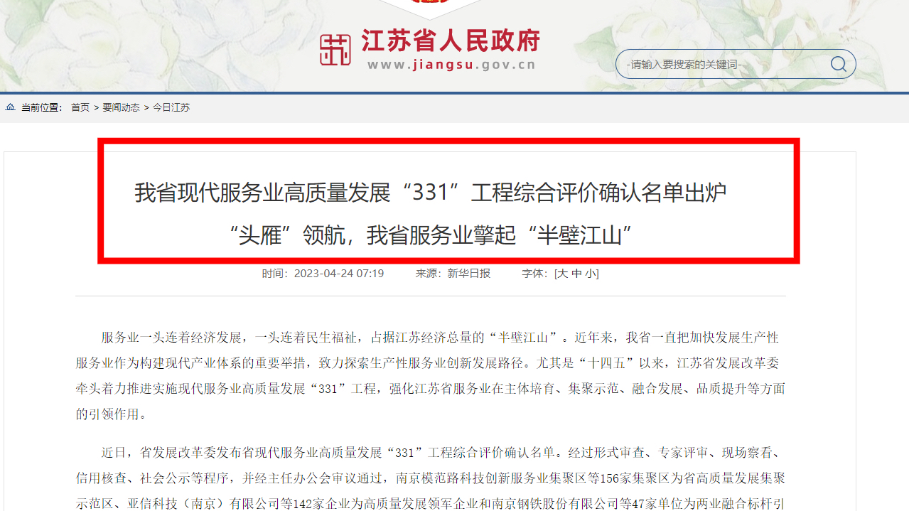 近日,新立訊科技股份有限公司上榜江蘇省現代服務業高質量發展領軍企業“331”工程綜合評價確認名單中領軍企業。